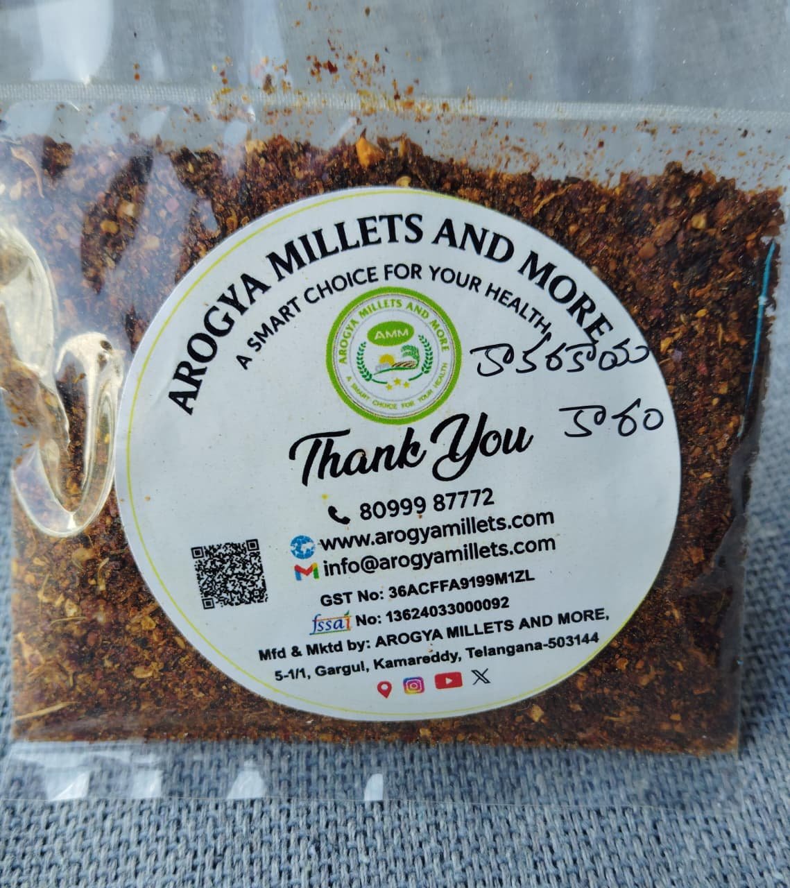 Kakarakaya Karam is a bold, flavorful dry chutney powder made from sun-dried bitter gourd (kakarakaya) blended with a fiery mix of spices, red chilies, garlic, and lentils. A treasured delicacy in Andhra cuisine, this unique karam balances the bitterness of kakarakaya with the spice and aroma of traditional Indian masalas, creating a deeply satisfying flavor.